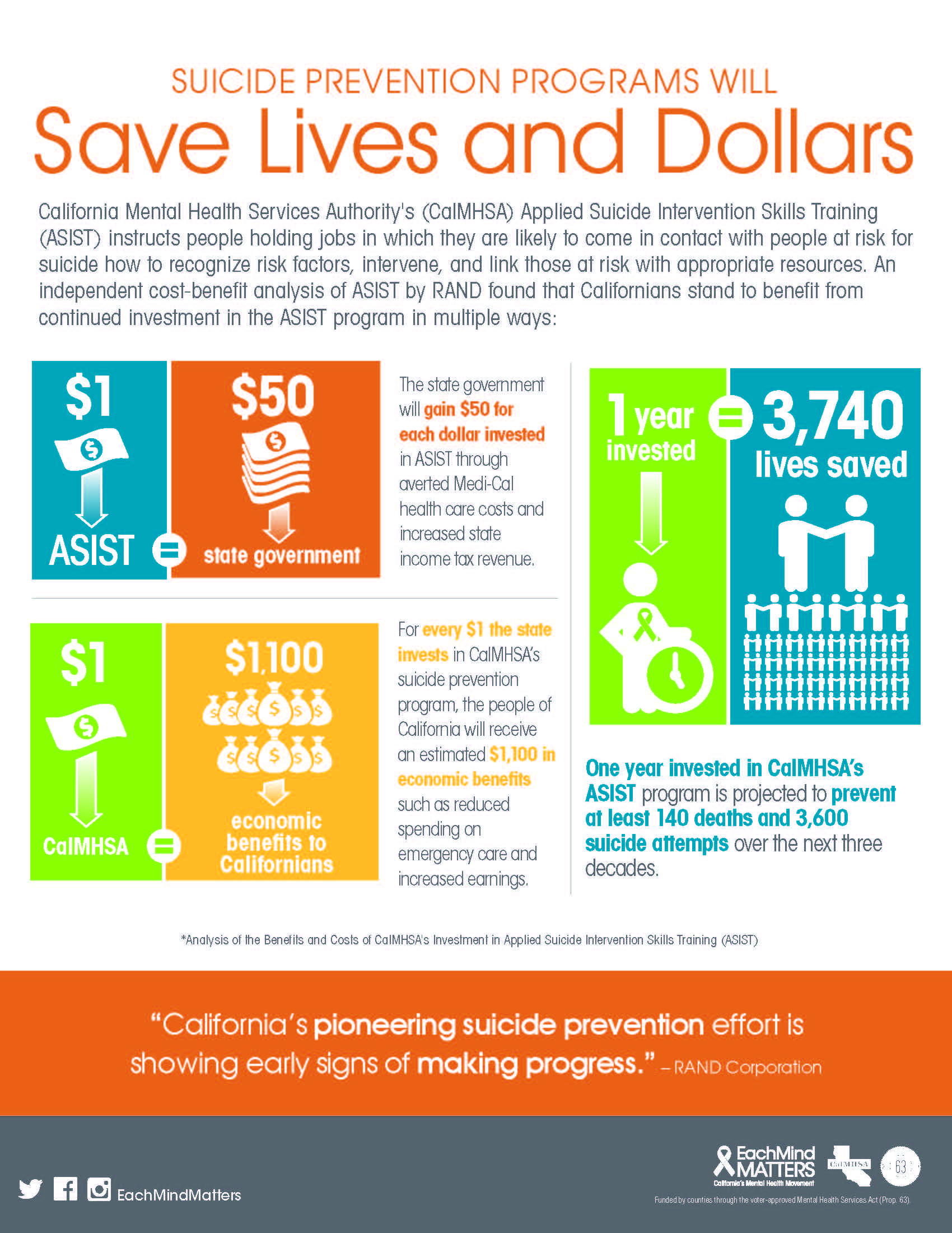 The CalMHSA RAND Infographics 2015 provide visual representations of the RAND studies about the effectiveness of CalMHSA programs in reducing stigma and raising awareness of mental health and suicide prevention in California. These infographics were designed to provide a snapshot of the positive effects from the numerous programs sponsored by CalMHSA.