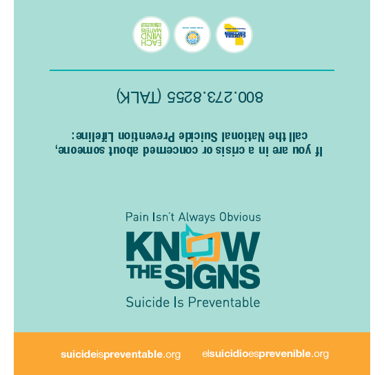 This is a small print-ready tent card with a listing of the signs that someone may be struggling with mental health, as well as recommended outreach strategies. These are designed to be folded in two and set up like a "tent." This tent card includes links to online resources, including the Each Mind Matters Resource Center.