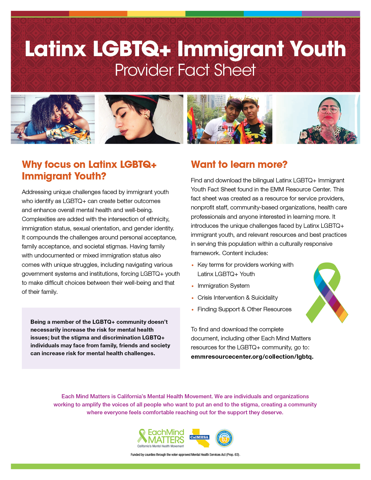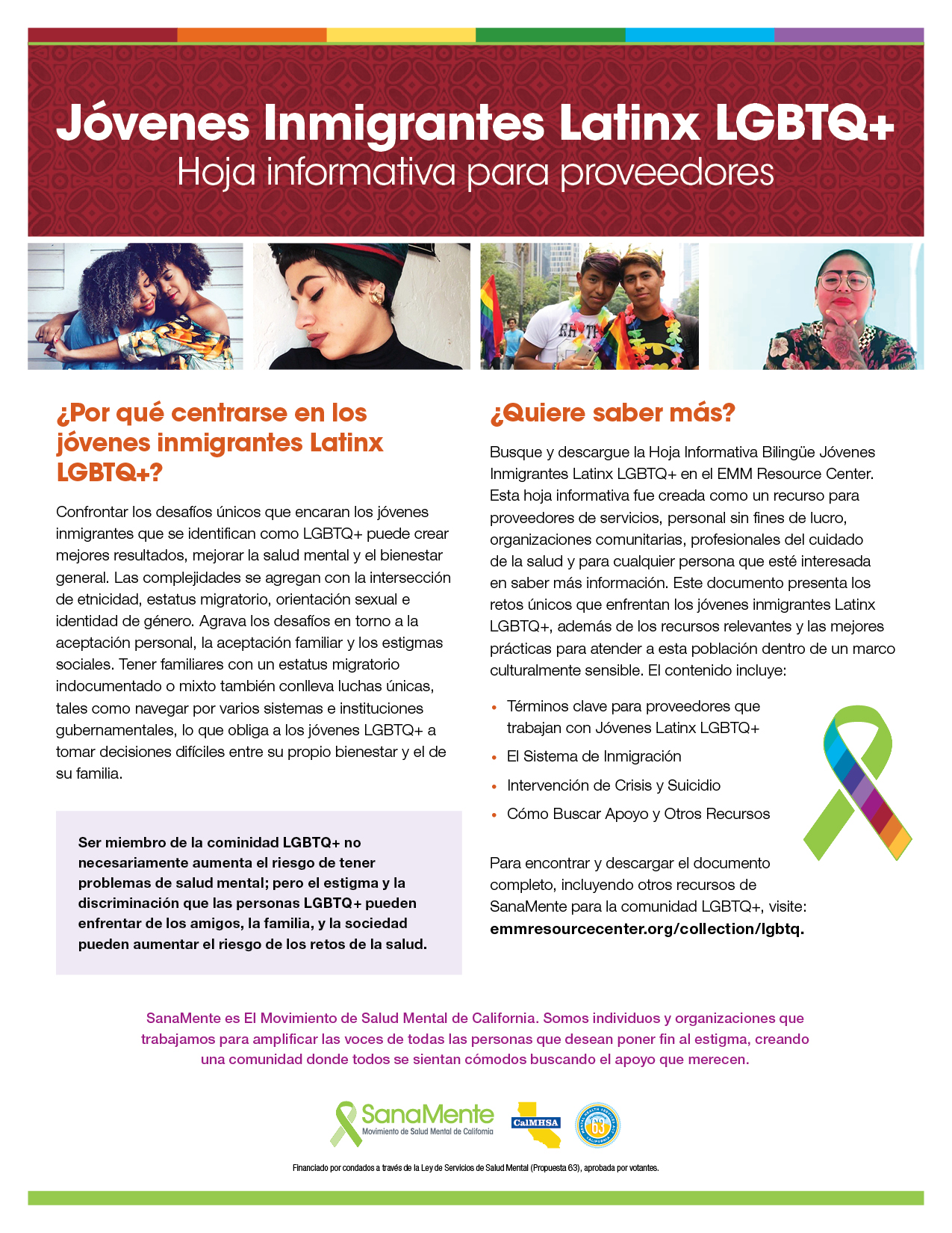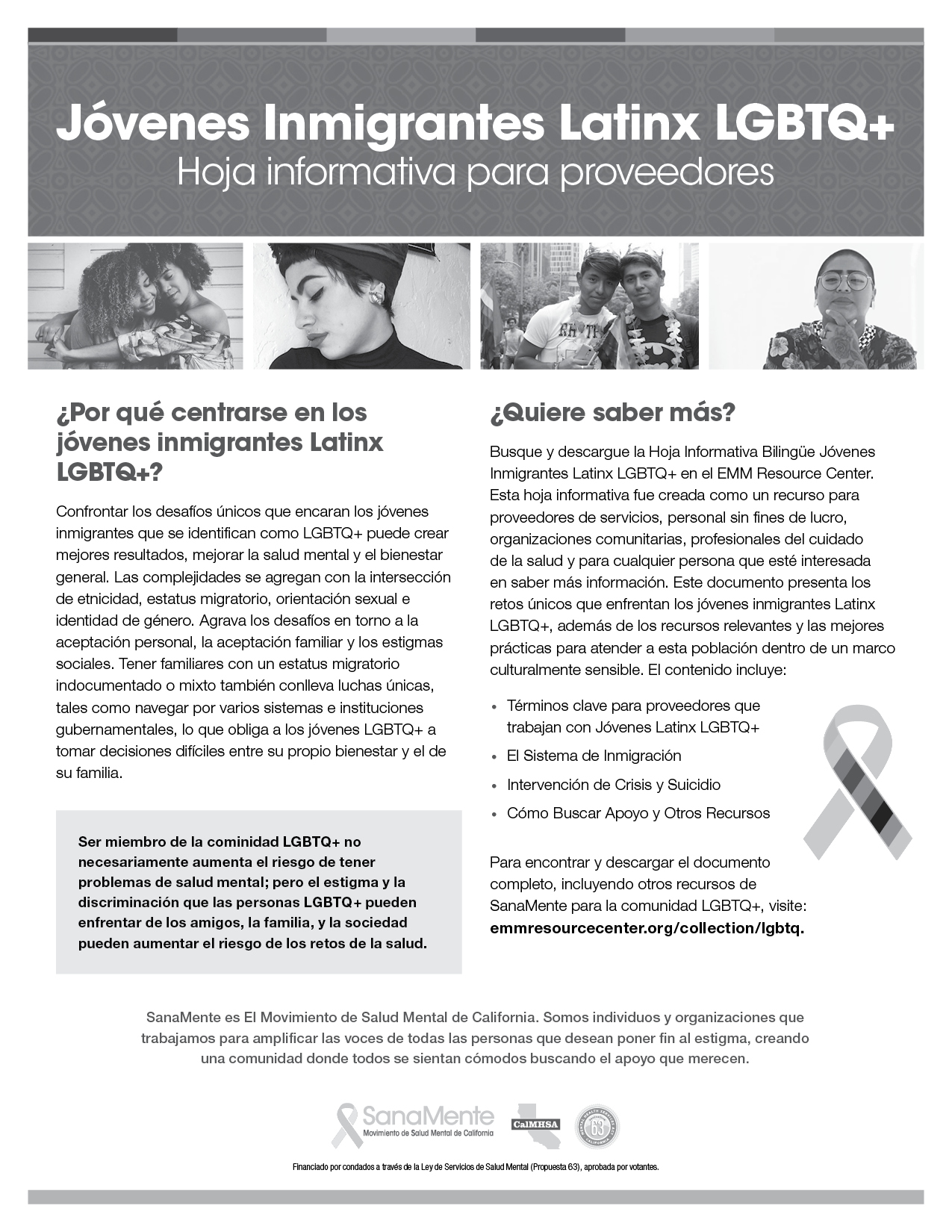 Este documento bilingüe fue creado para que los usuarios puedan descargar el paquete informativo, llamado Latinx LGBTQ+, en el centro de recursos de Each Mind Matters. El documento puede ser usado en eventos, áreas de recursos o en salas de espera para crear conciencia hacia la existencia del paquete informativo de 24 hojas.