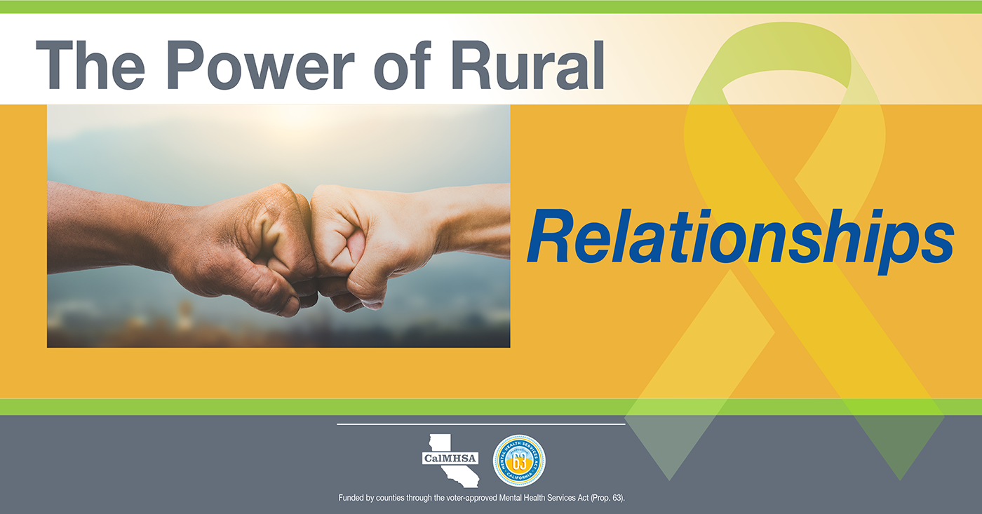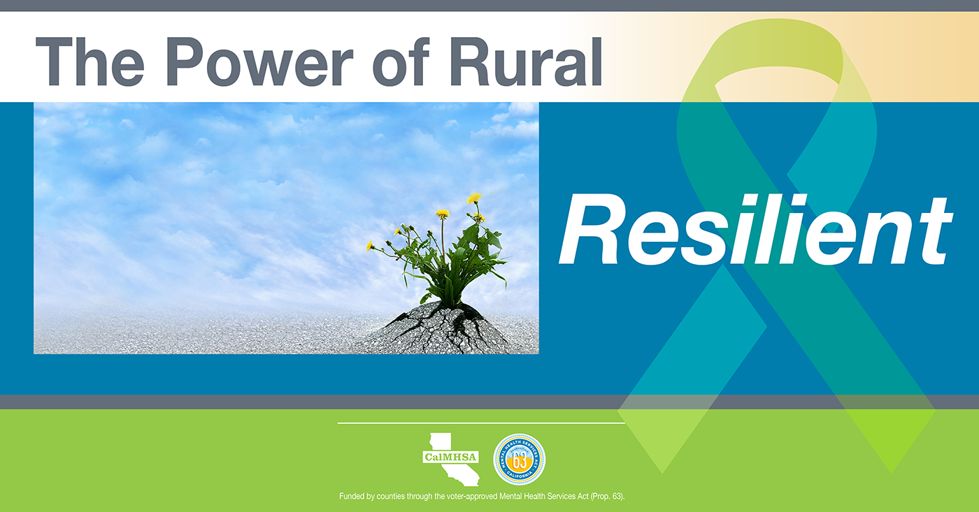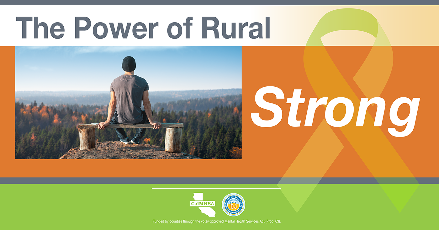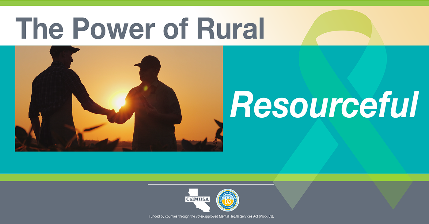 Several characteristics of rural life can compound the risk of suicide, including isolation, limited behavioral health services, and the impacts of natural disasters such as wildfires and drought. Yet rural areas are also characterized by strong and tight-knit communities with a willingness to come together in times of trouble. Rural residents are resourceful, know their neighbors and will have each other's backs when they know what to look for and how to help. These rural community resources are meant to celebrate our California rural communities. These resources were developed in support of National Rural Health Day (November 18th, 2021) and to shine light on the strength, resiliency, and power of rural communities, join in celebrating the power of rural with these resources, but can we used throughout the year.