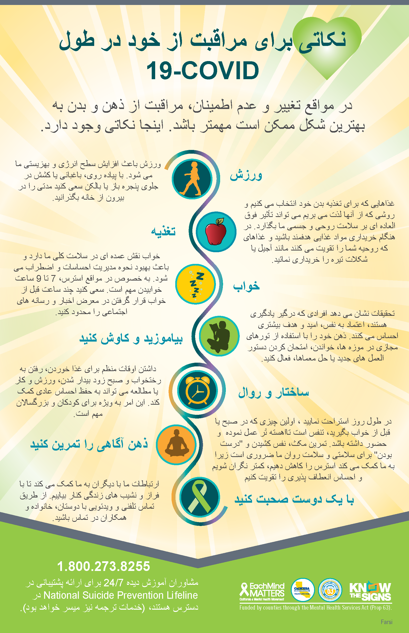 While it’s necessary to keep up-to-date and make changes to daily life in order to help control the spread of COVID-19 (coronavirus), the constant news cycle coupled with social distancing measures can have a real impact on mental health. During times of change and uncertainty it is ever more important to incorporate self-care and structure into your schedule. And while your typical self-care routine may no longer be available, there are ways to stay healthy and remain connected. Every day take a moment (or more) to take care of yourself. Resources are linguistically and culturally adapted for Farsi-speaking populations through a community review process.