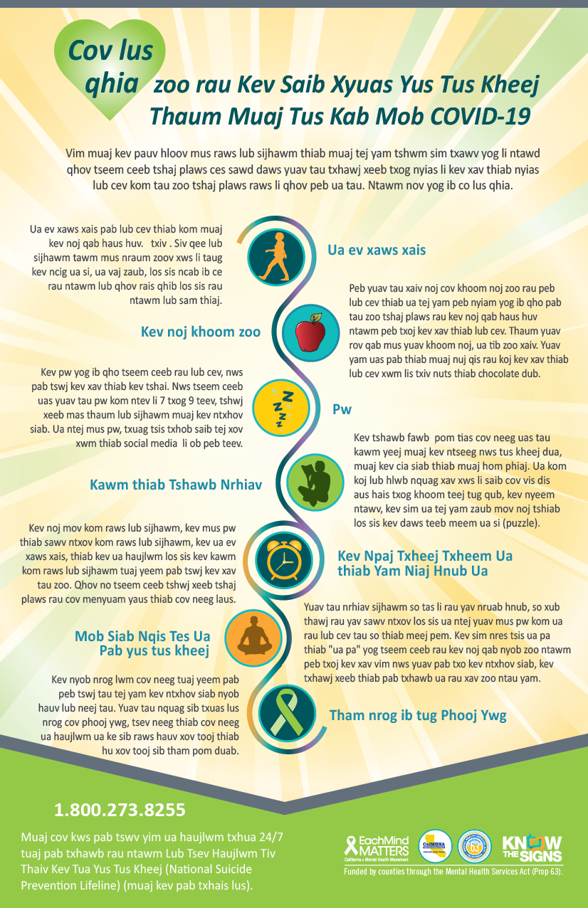 While it’s necessary to keep up-to-date and make changes to daily life in order to help control the spread of COVID-19 (coronavirus), the constant news cycle coupled with social distancing measures can have a real impact on mental health. During times of change and uncertainty it is ever more important to incorporate self-care and structure into your schedule. And while your typical self-care routine may no longer be available, there are ways to stay healthy and remain connected. Every day take a moment (or more) to take care of yourself. Resources are linguistically and culturally adapted for Hmong populations through a community review process.