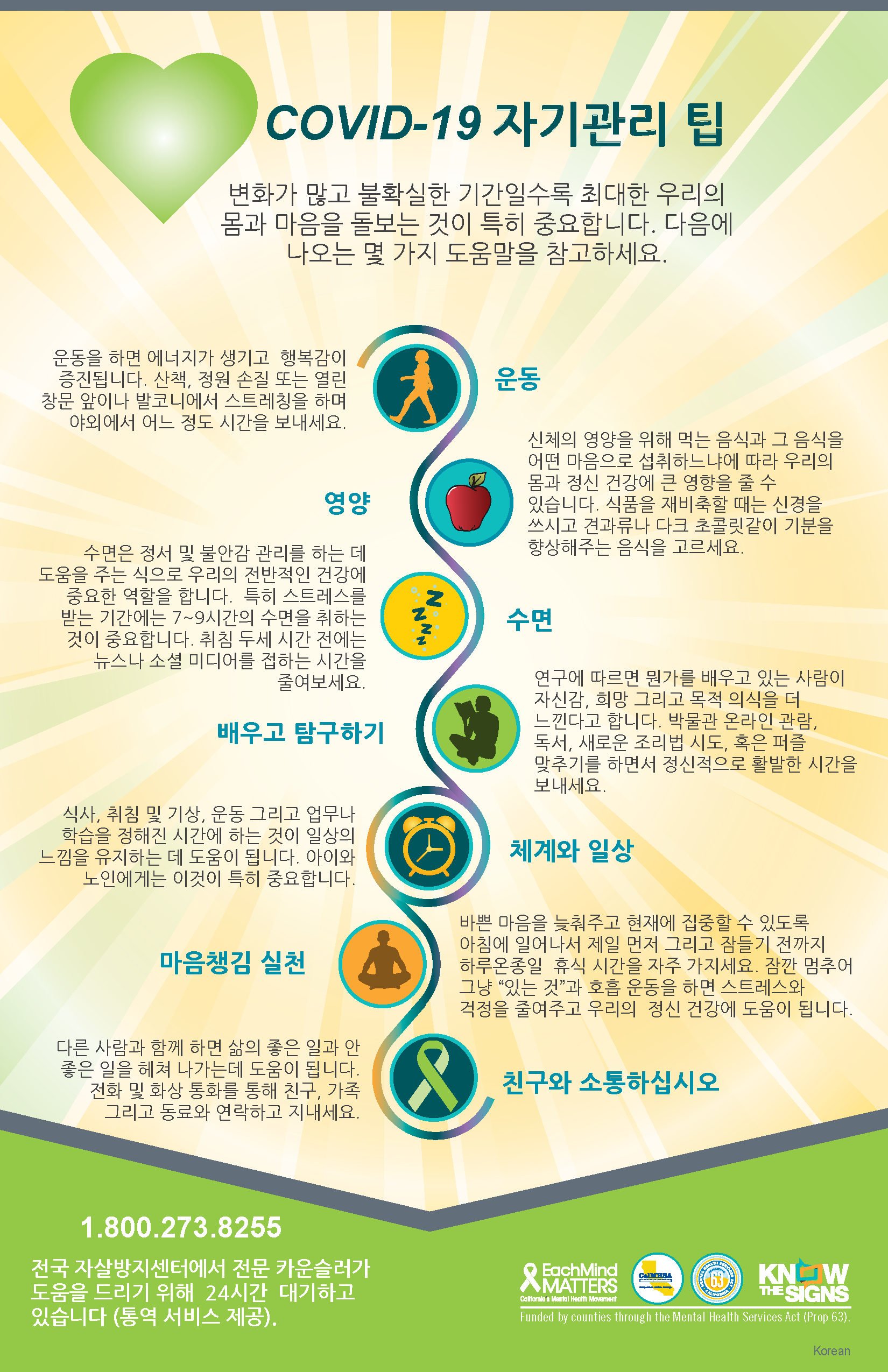 While it’s necessary to keep up-to-date and make changes to daily life in order to help control the spread of COVID-19 (coronavirus), the constant news cycle coupled with social distancing measures can have a real impact on mental health. During times of change and uncertainty it is ever more important to incorporate self-care and structure into your schedule. And while your typical self-care routine may no longer be available, there are ways to stay healthy and remain connected. Every day take a moment (or more) to take care of yourself. Resources are linguistically and culturally adapted for Korean populations through a community review process.