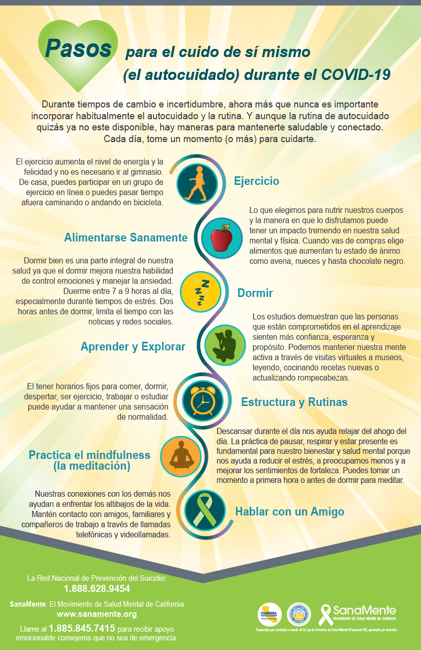 While it’s necessary to keep up-to-date and make changes to daily life in order to help control the spread of COVID-19 (coronavirus), the constant news cycle coupled with social distancing measures can have a real impact on mental health. During times of change and uncertainty it is ever more important to incorporate self-care and structure into your schedule. And while your typical self-care routine may no longer be available, there are ways to stay healthy and remain connected. Every day take a moment (or more) to take care of yourself. Resources are linguistically and culturally adapted for Spanish-speaking populations through a community review process.