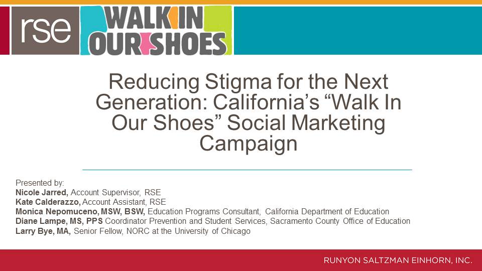 The Walk In Our Shoes International Conference Presentation details the methodology and results of the youth mental health program sponsored by Each Mind Matters. This presentation was developed and disseminated in 2015 to an international audience invested in learning new strategies to raise awareness of mental health.