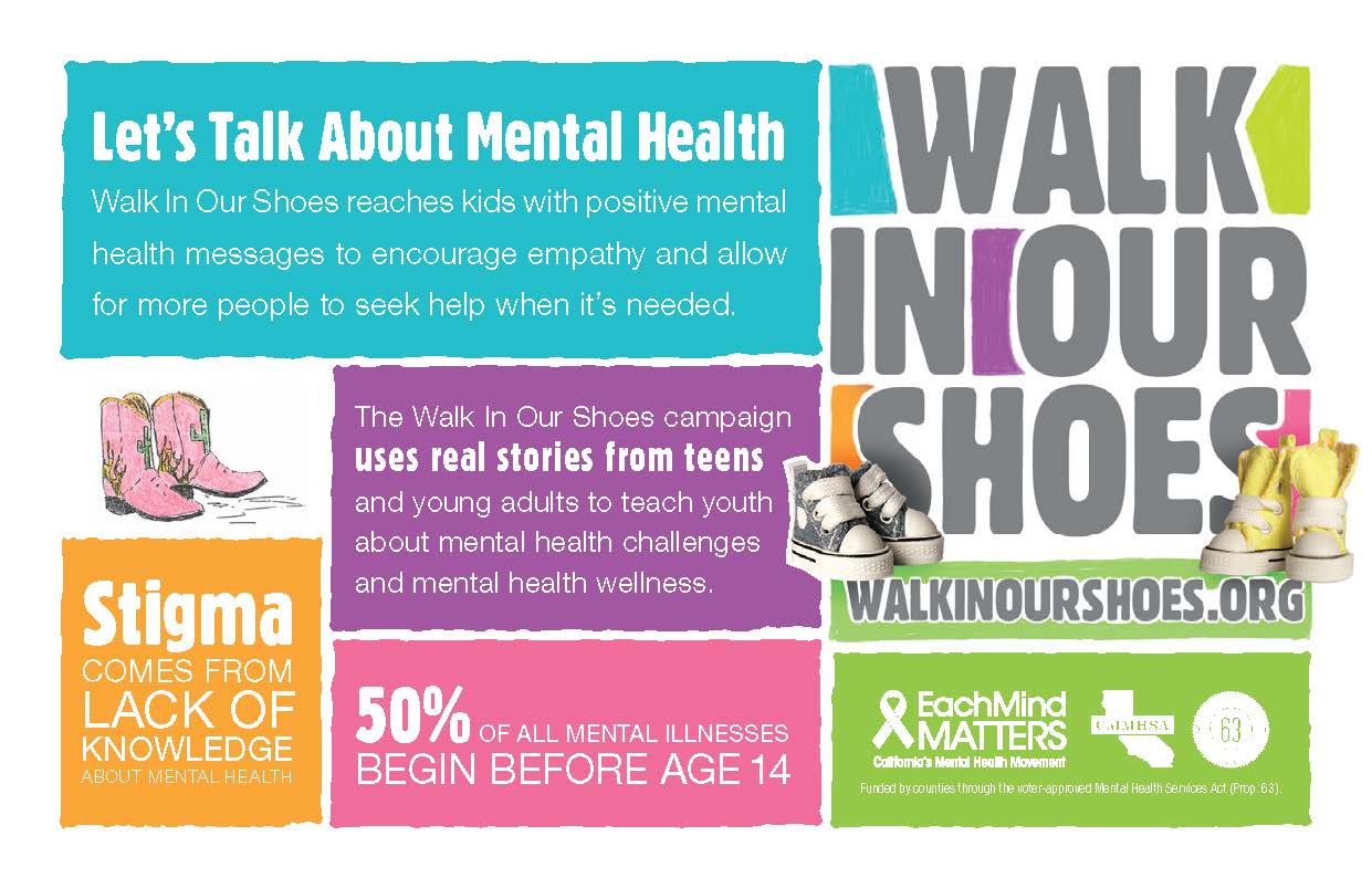 The Walk In Our Shoes Take-One is a half-page double-sided handout containing a brief background on the Walk In Our Shoes youth mental health program and outlining the resources available for students, teachers, and parents. This handout is ideal for resource fairs and events to provide individuals with a take-away piece about the program and drive them to visit the program website for more information and resources.
